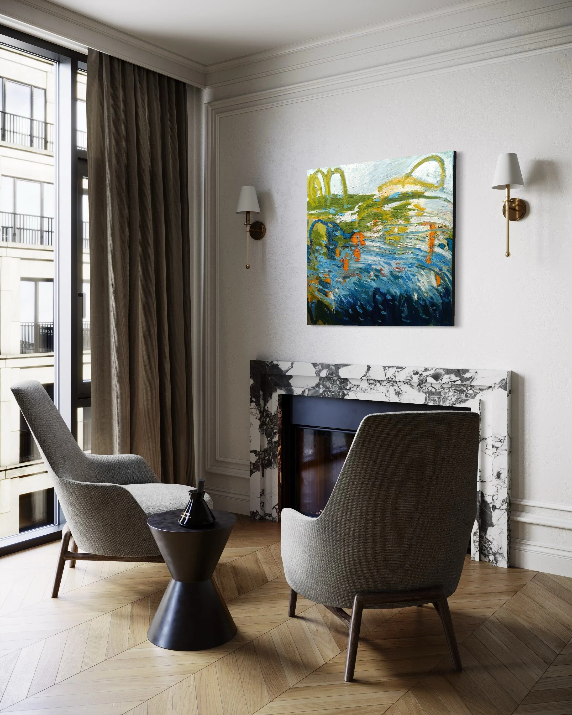 36” x 36” Oil on Wood Panel. Wired and ready to hang.